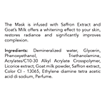 the mask is infused with saffron extract and goat milk offers a whitening effect to your skin, restores radiance and significantly improves complexion. The mask has a brightening effect on the skin, restores the lost radiance and glow. Also, significantly improves complexion.