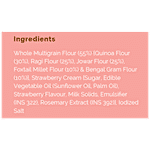 Whole Multigrain Flour (55%) quinoa Flour (30%), Ragi Flour (25%), Jowar Flour (25%), Foxtail Millet Flour (Zn) & Bengal Gram Flour (s0%)}, Strawberry Cream {Sugar, Edible Vegetable Oil (Sunflower Oil, Palm Oil), Strawberry Flavour, Milk Solids, Emulsifier (INS 322), Rosemary Extract (INS 392)1, Iodized Salt.