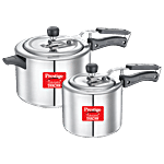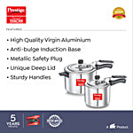 The Prestige Pressure Cooker Aluminium Nakshatra Svachh is a versatile and practical cookware set that includes two bodies and two lids. This combination set gives the ideal option for your cooking needs with capacities of 5 and 3 litres. It's perfect for gatherings or when you need to cook several dishes at once because the two distinct bodies let you make different dishes at once or cook in larger volumes. Two lids are included in the package, which guarantees that your food will stay hot and tasty until it's time to serve. The Prestige Al Nak Pls Combi was created with utility in mind and has a robust structure that ensures durability and long-lasting performance. Your food will be perfectly prepared because the cookware set is comprised of high-quality materials that transmit heat evenly. The tight fit of the lid's traps heat and steam inside, preserving the nutrients and flavours of your food. The set comes with ergonomic handles that are designed to provide you with a secure hold while you're cooking. You may move the cookware without worrying about getting burned because these handles are cool to the touch. Your kitchen gains a touch of elegance with its sleek and contemporary design. This cookware set is a dependable and fashionable option whether you're preparing meals for your family or hosting a dinner party. So, purchase this Prestige Al Nak Pls Combi 5 litres & 3 litres Two Bodies 2 LID, 2 Pc exclusively on Big Basket and have it delivered right to your doorstep.