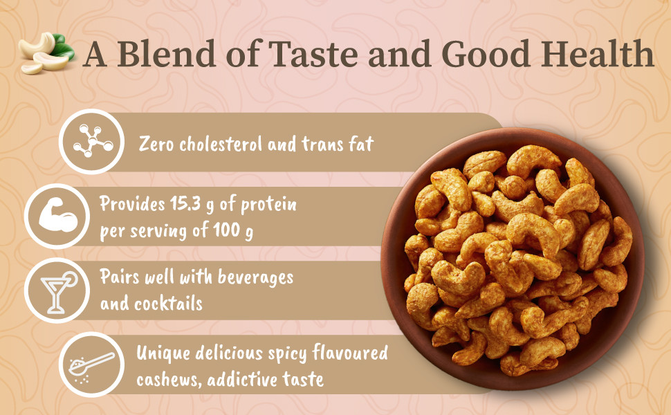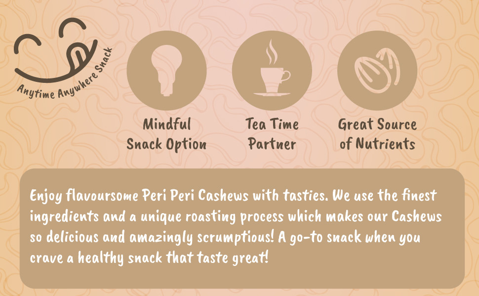 About the productEnjoy the flavour of scrumptious nuts with Tasties Peri Peri Cashews. It offers a tantalising impact so that you can depart you looking to chunk extra each time. They are rich in fibre, protein, and healthy fats. It also incorporates a number of vitamins, minerals, and health-protecting beneficial plant compounds. This nut makes the perfect snack option. Crunchy cashews coated generously with chilli spice will infuse your mouth with the flavours you crave more.Cashew (95.96%), Peri Peri Seasoning (3%) (Cayenne Pepper, Garlic Powder, Ginger Powder, Black Pepper Powder, Black Salt, Iodised Salt, Dried Mango Powder, Oregano, Onion Powder, Sugar, Anticaking Agent (E551), Stabilizer (E415)) And Iodised Salt.
