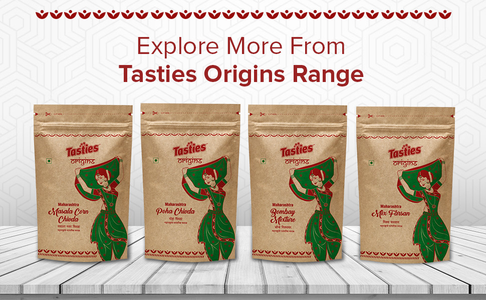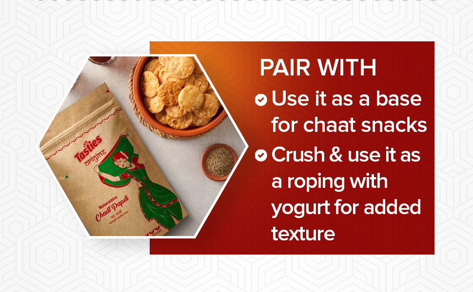 The Maharashtra Chaat Namkeen Papdi - Crispy is the ultimate treat that you can add to your chaat parties and your savoury cravings. It is served best as teatime snacks and homemade chaats. It is the perfect munchie to add to your pantry. Freshly blended with traditional Maharashtrian spices and made with local recipes, our Maharashtra Chaat Namkeen Papdi - Crispy comes with a spicy tadka and is naturally processed with the finest wheat flour and local ajwain. Our Maharashtra Chaat Namkeen Papdi - Crispy is a crispy, delicious treat that you can revel in at any time of the day and is sure to make your tastebuds dance. Best accompanied with other chaats and fresh beverages, this treat is sure to make your long day less boring and add flavour to it. Packed with nutrition, our Maharashtra Chaat Namkeen Papdi - Crispy has no added preservatives and cholesterol and is the perfect snack to have. Indulge in savoury goodness with our Maharashtra Chaat Namkeen Papdi - Crispy now! Experiment with the eclectic range of Tasties Origins Namkeen collections on Big Basket from Lahsun Sev, Indori Mixture, and more where tradition meets flavour in local recipes.