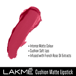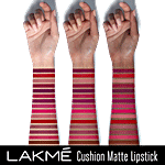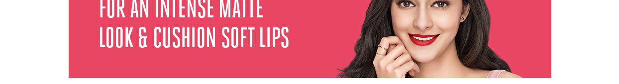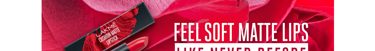 Presenting the new Lakmé Cushion Matte Lipstick. An exclusive new matte lipstick with a revolutionary soft matte formula that makes matte lips feel soft and comfortable. This soft matte lip colour has an intense colour payoff that gives lips a matte yet soft-focus effect. The soft matte formula is enriched with rose oil extracts from France which give your matte lips a moisturized, comfortable feel. Its non-drying formula doesn’t dry your lips and leaves them feeling soft and looking intensely matte. The new Lakmé Cushion Matte Lipstick cushions your lips in a single stroke with its smooth and creamy application. To get an even and uniform matte finish on your lips, start by defining your cupid’s bow, then smoothly glide the lipstick to the other edge of both your upper and lower lips. Lakmé Cushion Matte is a water-resistant soft matte lipstick that gives you a long-lasting intense matte colour and cushions soft lips all day. Choose from 35 vibrant matte shades and wear cushiony soft lips for a variety of occasions. To complete your soft matte look, pair your cushion matte lips with Lakmé Eyeconic Lash Curling Mascara, and Lakmé Impact Eyeliner. Try it now!