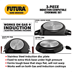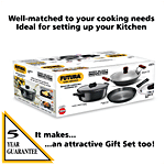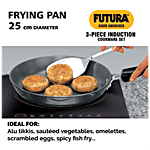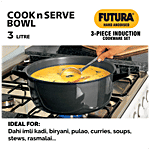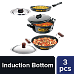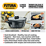Hawkins Futura Induction Compatible Hard Anodised Cookware Set consists of Frying Pan, Deep-Fry Pan, Cook-n-Serve Bowl with One Hard Anodised Lid. It is made with hard-anodized, which helps in even distribution of heat. It is an ideal cookware for any kitchen. It is easy to clean, wash and is long-lasting. This cookware is used for preparing and cooking food or stylishly serving food. It doesn't burn food and retains essential minerals in food. The deep fry pan is ideal for samosas, vegetables, for making sweets and much more deep frying foods. Frypan is used for frying, searing, and browning foods. All these cookware have a comfortable handle which makes them easy to carry and handle. It is compatible with both gas stoves as well as induction.