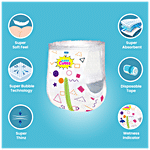 Super Thinz 5 layer core technology for a lightweight diaper Super Soft Feel top sheet prevents any rashes and itching Super Absorbent gel lock technology across two layers prevents leakage and spillage Super Bubble Technology works to prevent lumps by evenly distributing the liquid. Disposable Tape to wrap the soiled diaper securely Wetness Indicator lets you know when it's time to change the diaper All night protection with 2x absorption Get 29 piece Super Cute's Wonderthinz Diapers of Medium size.