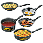 No Question askedHawkins Futura Non-Stick Cookware Set - Two Frying Pans, Deep-Fry Pan, Saucepan, Curry Pan/Saute Pan With Two Glass Lids, Black, NSET4