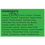 Water(15%), Onion, Indian Cottage Cheese, Tomato, Capsicum, Watermelon Seeds, Fresh Cream, Cashew Nuts, Palmolein Oil, Sunflower Oil, Butter, Ginger, Garlic, Salt, Green Chilli, Coriander Leaves, Spices (Red Chilli Powder, Coriander Powder, Cumin Powder, Turmeric, Whole Red Chilli, Coriander Seeds, Cinnamon, Green Cardamom).