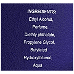 Ethyl Alcohol, Perfume, Diethly Phthalate, Propylene Glycol, Butylated Hydroxytoluene, Aqua.