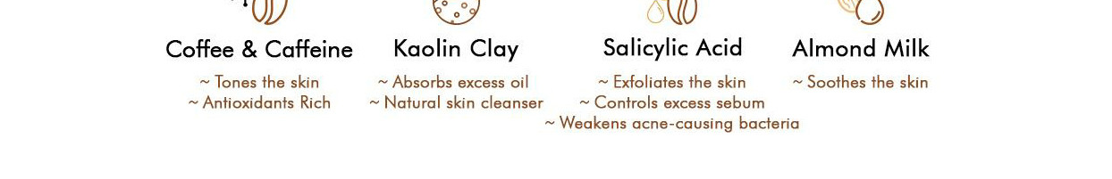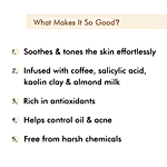 Cappuccino Coffee Face Mask helps in removing 99.9% Acne-Causing Germs* Experience the freshness of the coffee face mask as it attacks the oil & acne; isnt this what your skin always needed? Cappuccino Coffee Face Mask has excellent ingredients to keep acne at bay. Its jelly-like unique texture, and vibrant & refreshing coffee notes feel reviving upon the skin! Everyday dirt, pollution & weather changes can make your skin extra oily. This excess oil formed can lead to the formation of acne. Hence it is necessary to cleanse this excess oil & remove the dirt from the skin to prevent acne. Here comes the Cappuccino Coffee Face Mask to clear out the skin & combat acne! The Cappuccino Coffee Face Mask for acne is powered by Salicylic Acid that helps weaken the acne-causing bacteria and Kills 99.9% Acne Causing Germs. It also exfoliates and penetrates the pores to get your skin rid of excess oil. Salicylic Acid helps in acne control, effectively. The mask also has Kaolin Clay which is known as a natural skin cleanser. It sucks out all the excess oil, helping in oil control. The Caffeine-rich Coffee tones the skin and is packed with antioxidants. The Cappuccino Coffee Face Mask for oily skin will revive your skin with its clean formulation. It is Vegan, Cruelty-free & Peta Certified. It is free from SLS and Paraben, FDA-approved, and dermatologically tested. *Based on In-vitro antimicrobial activity study March 2021 conducted by a lab that is ISO-17025 accredited by the National Accreditation Board for Laboratories (NABL).