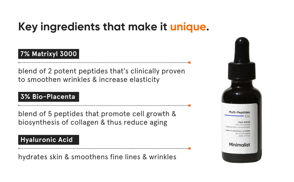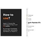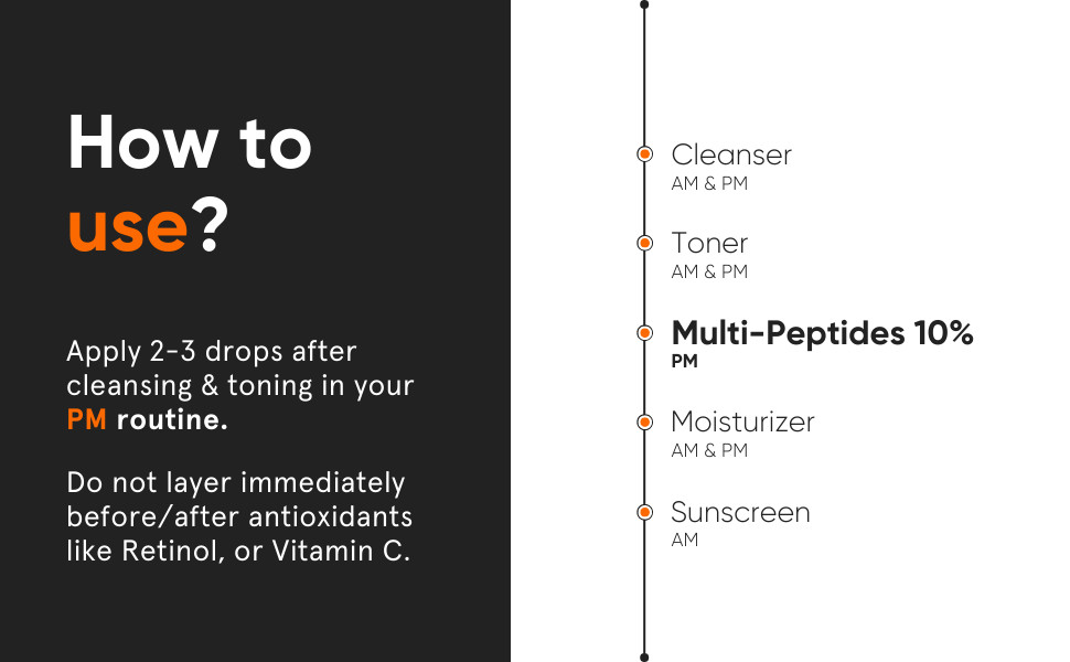 About the product1. You can use peptides preferably in the PM skincare regime to get its maximum benefits. After cleansing your face with a mild cleanser and hydrating with hyaluronic acid (if using), apply the multi-peptide serum with the dropper and spread it evenly on the skin.