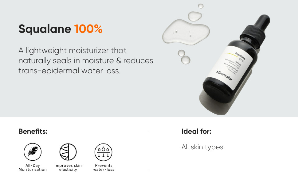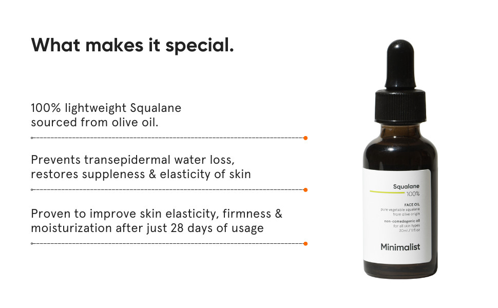 A very lightweight moisturiser that naturally seal in moisture and significantly reduces trans-epidermal water loss in cases wherein the skin barrier is disrupted. Non-sticky and non-comedogenic. 100% lightweight Squalane sourced from olive oil. It prevents transepidermal water loss, restores suppleness and elasticity of skin Promotes faster restoration of the skin barrier function. Proven to significantly improve skin elasticity, firmness & moisturization after just 28 days of usage. This pure squalane is sourced from Sophim, France who are leaders in production of vegetable Squalane. This product is Ecocert approved.