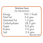 Refined Wheat flour, Soy Beans, Onion, R.O. Water, Ginger, Garlic, Green Chilli, Coriander, Vanasapati, Salt, Refined Palmolein Oil, Artificial Flavour Emulsifier (E481), (E472e). No Preservatives.