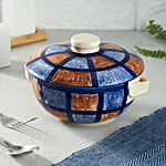 bb home Earth Serving/Mixing Bowl With Lid, Hand- Painted Ceramic, Checkered Yellow & Blue, 500 ml