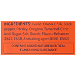Garlic, Onion, Chilli, Black Pepper, Parsley, Oregano, Tamarind, Citric Acid, Sugar, Salt, Starch, Flavour Enhancer (E627, E631), Anticaking agent (E551, E552).