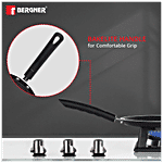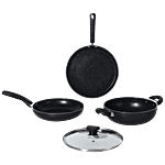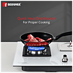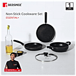 Bergner Essential Plus 4 Pcs Cookware Set consists of Kadhai with Lid, Tawa and Frypan. It is made with heavy gauge pressurized aluminium, which helps in the even distribution of heat. It is an ideal cookware for any kitchen. It is easy to clean, wash and is long-lasting. This cookware is used for preparing and cooking food or stylishly serving food. It doesn't burn food and retains essential minerals in food. Kadhai is ideal for samosas, vegetables, making sweets and much more deep frying foods. This Kadai comes with a lid. Tawa is used to make chapatti, roti, paratha, etc. Frypan is used for frying, searing, and browning foods. All have a comfortable handle which makes them easy to carry and handle. It is compatible with both gas stoves as well as induction.