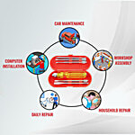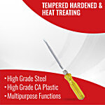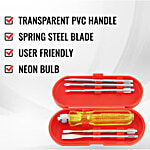 This screwdriver kit features a handle crafted from high-grade CA plastic, making it non-flammable and resistant to oil, petrol, grease, water, and most other substances. The blades are differentially hardened and tempered to withstand wear and bending, and to meet high torque demands. A bright, smooth nickel chrome plating offers effective protection against corrosion. Designed with user comfort in mind, the screwdrivers provide a secure grip and easy handling, ensuring hassle-free usage. This value-for-money kit includes five screwdriver blades along with a tester.