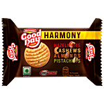 Britannia's delicious Good Day cookies are enriched with hazelnuts, cashews, pistachios, and almonds. A delightful anytime snack by Britannia India, also available in 50-50, Tiger, NutriChoice, Bourbon, Milk Bikis, and Marie Gold variants.