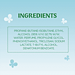 Propane-Butane-Isobutane, Ethyl Alcohol (95% V V) 32.7% W W, Water, Perfume, Propylene Glycol, Phenoxyethanol, Triclosan, Sodium Lactate, T-butyl Alcohol, Denatonium Benzoate.
