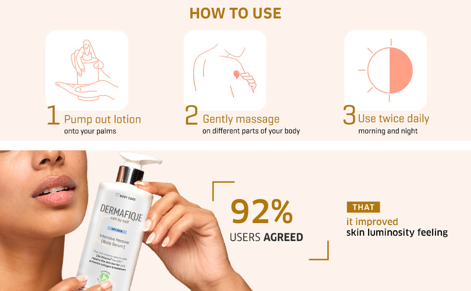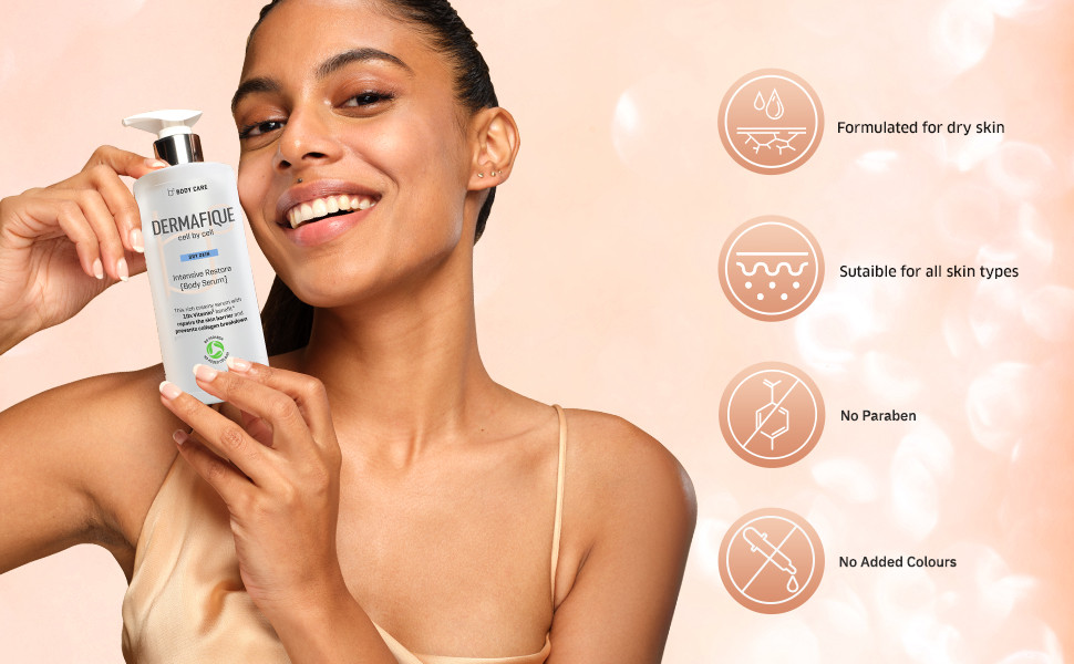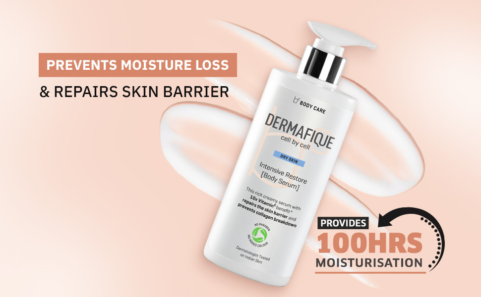 Dry skin can be a result of multiple external and internal factors. While it may not be possible to tackle all external factors, it is possible to treat your skin to nourishing skincare that can combat internal factors like skin cell repair and skin barrier strengthening. The Dermafique Intensive Restore Body Serum is enriched with 10x Vitamin E to give parched skin a surge of moisture. This rich and creamy body serum repairs the skin's barrier to prevent moisture loss and prevents collagen breakdown to give you supple, glowing skin. Vitamin E combats skin damage caused due to free radicals (molecules) produced by toxins in the environment. It also soothes skin that experiences irritation due to environmental conditions. It also heals and strengthens the skin's barrier to prevent moisture from escaping. This simple yet effective formula is designed specifically for dry skin. It repairs, heals and soothes dryness.