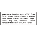 Boneless Mutton (55%), Soya, Garam Masala, Spices, Coriander Powder, White Pepper Powder, Salt, Garlic, Ginger, Green Chilly, Mint, Coriander, Cummin Powder, Potato Flakes and Onion Flakes