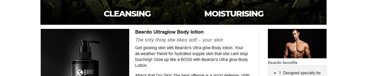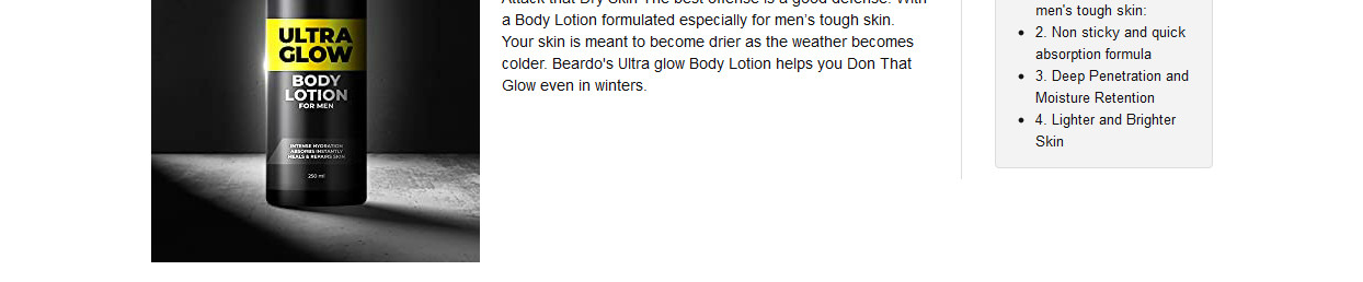 The best offence is a good defence. With a Body Lotion formulated especially for men’s tough skin. Your skin is meant to become drier as the weather becomes colder.? ?Formulated especially for men's tough skin, Ultra Glow body lotion keeps your skin moisturized and looking great. Treat your skin with a generous dose of Moisture with Beardo Ultralgow Body Lotion