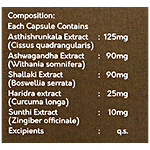 Asthishrunkala Extract (Cissus Quadrangularis) : 125mg Ashwagandha Extract (Withania Somnifera) : 90 mg Shallaki Extract (Boswellia Serrata) : 90mg Haridra Extract (Curcuma longa) : 25 mg Sunthi Extract (Zingiber Officinale) : 10mg Excipients : Q.S.