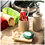 This set of ceramic bathroom accessories is sure to beautify your space. The dispensers have a press pump system, which can be used for liquid soap or other spa essentials and the tumbler and tray are useful in many ways. The set comprises of dispenser, tumbler and soap tray. Handcrafted in ceramic, this set serves you well.