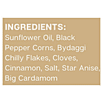 Sunflower Oil, Black Pepper Corn, Bydaggi Chilly Flakes, Cloves, Cinnamon, Salt, Star Anise & Big Cardamom.