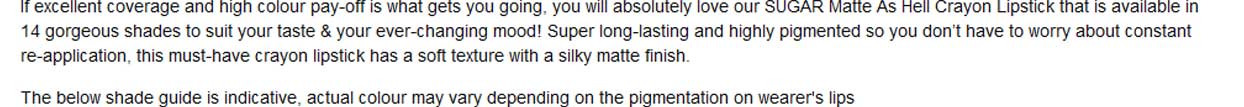 If excellent coverage and high colour pay-off are what gets you going, you will absolutely love our SUGAR Matte As Hell Crayon Lipstick that is available in 25 gorgeous shades to suit your taste & your ever-changing mood! Super long-lasting and highly pigmented so you don’t have to worry about constant re-application, this must-have crayon lipstick has a soft texture with a silky matte finish. A bolt of cherry red that can update your look in a flash, Cherry Darling never fails to impress and is best worn alone for maximum impact.