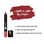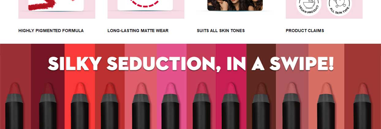 A richly pigmented crayon lipstick with super long-lasting and water-resistant wear. With high-colour payoff in a single swipe, it lends a gorgeous silky matte finish. Available in 36 shades. 26 Vianne Rocher (Deep Chocolate Brown) A shade that'll make your pout stand out. 27 Sunny Randall (Warm-toned light coral) This colour subtly tantalizes your senses. 28 Honey Rider (Deep Peach Pink) Chic and bold, together in one shade. 29 Molly Brown (Peachy brown) A stunner defining grit and grace. 30 Lillian Rose (Magenta) This hue sets the bold meter racing. 31 Poppy Adams (Raspberry Pink) A colour made of power and poise. 32 Miss Rosa (Dusky Rose) A humble shade of warmth and charm. 33 Pepper Anderson (Orangey red) A shade that's always on the bright side. 34 Cherry Ames (Cool toned red) A gorgeous colour that's a statement in itself. 35 Claire Redfield (Pure red) A showstopper shade that's as bold as it's classy. 36 Veronica Mars (Brown Toned Burnt Orange) A shade to remind you of beautiful sunsets and good vibes.