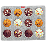 The HAZEL Aluminium Cupcake Muffin Mould has 12 round shaped cavities which lets you bake 12 muffins all at once. Made from food grade aluminium, this baking mould is safe, sturdy and convenient to use. The non stick coating ensures your muffins and cupcakes come off easily and the mould is easy to clean after. It is handy when you need to bake in large quantities and the mould can be used in a pressure cooker as well as an oven. It acts as a great replacement for paper cups. Explore HAZEL's exclusive range of bread and muffin moulds, and baking trays.