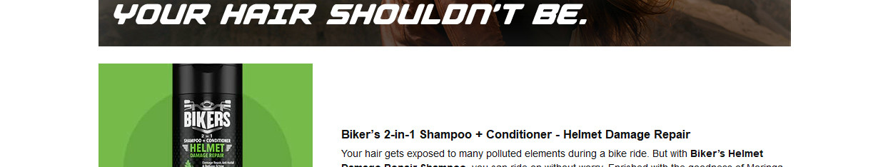 Now enjoy the journey without worrying about your hair with the all-new Biker's Helmet Damage Repair Shampoo + Conditioner. With the goodness of Moringa and Aloe Vera, this scientifically crafted helmet damage repair shampoo will give strong, clean, and conditioned hair as you drive through the day on wheels. Biker's helmet damage repair is just what you need.