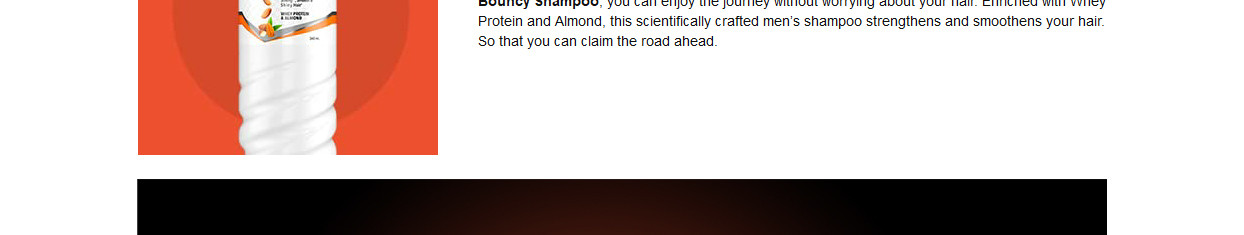 Now enjoy the journey without worrying about your hair with the all-new Biker's Strong & Bouncy Shampoo. With the goodness of Whey protein and Almonds, this scientifically crafted Strong & Bouncy shampoo will give you smooth, strong and shiny hair as you drive through the day on wheels. Biker's Strong and Bouncy shampoo is just what you need.