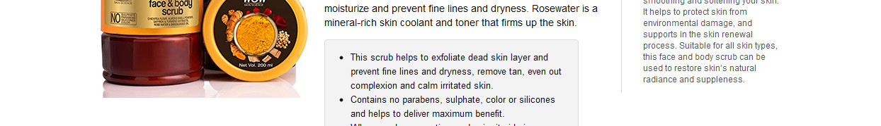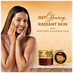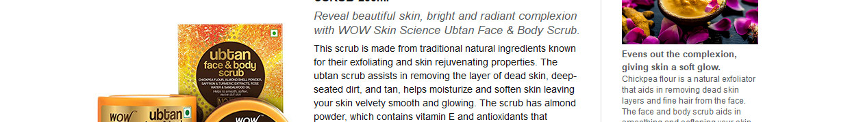 Ubtan - the beauty secret of the queens, courtesans, ladies and brides of yore – is a paste made with herbs, oils, natural powders and extracts. Ubtans are traditional Ayurvedic beauty and wellness recipes meant to rejuvenate skin, body and mind. In the olden days, applying ubtan was ritualistic. Reveal beautiful skin, bright and radiant complexion with WOW Skin Science Ubtan Face & Body Scrub. This scrub is made from traditional natural ingredients known for their exfoliating and skin rejuvenating properties. The ubtan scrub assists in removing layers of dead skin, deep-seated dirt and tan, helps moisturize and soften skin leaving your skin velvety smooth and glowing. The scrub has almond powder, which contains vitamin E and antioxidants that moisturize and prevents fine lines and dryness. Rosewater is a mineral-rich skin coolant and toner that firms up the skin, evens out the complexion, giving skin a soft glow. Chickpea flour is a natural exfoliator that aids in removing dead skin layers and fine hair from the face. The face and body scrub aids in smoothing and softening your skin. It helps to protect skin from environmental damage and supports the skin renewal process. Suitable for all skin types, this face and body scrub can be used to restore the skin’s natural radiance and suppleness.