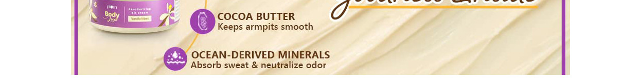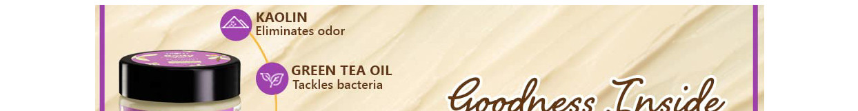Stinky pits? Time for a “sweet” ending :) Get sweet smellin’, odour-free pits for 12+ hours with antibacterial green tea oil & de-odorizing kaolin that tackles odour-causing bacteria. Plus sweat absorbin' ocean-derived minerals for that smooth, matte feeling. Bonus: No aluminium + no baking soda = no toxic build-up Get ready to fall in love: Get ready to tell your pits–“Welcome to the sweet sweet life!”