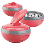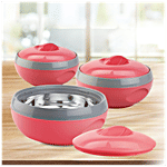 The Asian Venus Plastic Casseroles in a striking red colour can be used to store a variety of foods for long periods of time, keeping them warm and ready to serve at mealtimes. Coming in a set of 3, these casseroles have sizes ranging from 600ml to 1000ml and 1500ml so that you can store different quantities of food at the same time. They are also easily nestable, making them easy to put away. The outer body is virgin plastic, the inner body is stainless steel and the middle insulated portion is made from PUF thermal insulation, all of which combine to create a food container that keeps the temperature and flavour of your meals for a long time. They are also fridge-friendly so you can pop any leftovers in there for the next day. Explore the full range of Asian Cookware from casseroles to tiffins and lunch packs only on Big Basket.