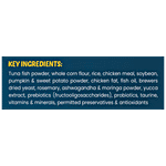 Tuna Fish Powder, Whole Corn Flour, Rice, Chicken Meal, Soybean, Pumpkin & Sweet Potato Powder, Chicken Fat, Fish Oil, Brewers Dried Yeast, Rosemary, Ashwagandha & Moringa Powder, Yucca Extract, Prebiotics (Fructooligosaccharides), Probiotics, Taurine, Vitamins & Minerals, Permitted Preservatives & Antioxidants