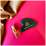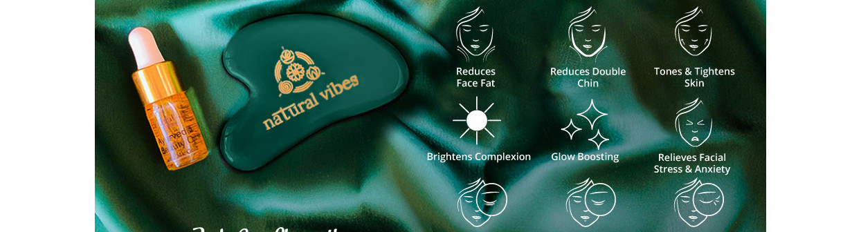 Natural Vibes Jade Gua Sha is made with a natural and mineral rich stone that is known to sculpt, tighten and relieve facial muscles. Known to be a part of ancient Asian skin care regimes, the gua sha has both healing and beautifying benefits. Traditionally Jade, in Chinese culture is considered to be a lucky stone that promotes nourishment, peace of mind and renewal. It has naturally cooling properties that will help your skin relax. Our Gua Sha will not only enhance your blood circulation but also detoxify the lymph nodes leaving you with a dewy glowy complexion. Using a Gua Sha will allow you to maximize the benefits of the oil you use as it will assist the nutrients to penetrate into the deeper layers of the skin. The precisely crafted edges will perfectly lift and tone the skin preventing premature signs of ageing, sagging, fine lines, wrinkles etc. It will supply the skin cells with oxygen, further relieving the stress and anxiety we unknowingly hold in our facial muscles. Natural Vibes Gua Sha comes with complimentary gold beauty oil that will work wonders on your skin and also endow you with peaceful sleep along with glowing skin. This carefully formulated elixir with 24 karat gold flakes is a blend of ingredients that have been integral in Ayurveda for generations such as Rosemary, Orange Peel, Tea tree, Patchouli, Chamomile, Rose, Pomegranate, Sandalwood, Lavender, Rosehip, Saffron, Lemongrass and Olives. Rich in vitamins, antioxidants and essential oils, our beauty oil will make your skin glow naturally, while visibly improving your skin's complexion. This lightweight oil, with the help of our Gua Sha will seep through your skin, hydrating and nourishing your cells with the missing nutrients that cause premature signs of ageing, discolouration and inflammation. The small particles of gold get absorbed into the skin imparting a rich glow and making your skin look healthy, fresh and much younger.