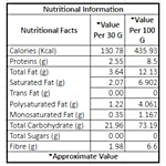 Nutrition per gram/ml: 100g Calories (Kcal): 435.93 Proteins (g): 8.5 Total Fat (g): 12.13 Saturated Fat (g): 6.902 Trans Fat (g): 0 Polysaturated Fat (g): 4.061 Monosaturated Fat (g): 1.167 Total Carbohydrate (g): 73.19 Total Sugars (g): 0 Fibre (g): 6.6