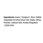 Jowar/ Sorghum, Rice, Edible Vegetable Oil (Rice Bran Oil), Malta, Whey Powder, Iodised Salt, Acidity Regulator