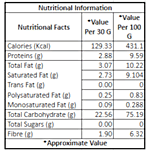 Nutrition per gram/ml: 100g Calories (Kcal): 129.33 kcal Proteins (g): 2.88 g Total Fat (g): 3.07 g Saturated Fat (g): 2.73 g Trans Fat (g): 0.00 g Polysaturated Fat (g): 0.25 g Monosaturated Fat (g): 0.09 g Total Carbohydrate (g): 22.56 g Total Sugars (g): 0.00 g Fibre (g): 1.90 g