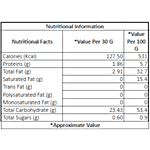Nutrition per gram/ml: 100g Calories (Kcal): 531 kcal Proteins (g): 5.7 g Total Fat (g): 32.7 g Saturated Fat (g): 15.4 g Trans Fat (g): 0 g Polysaturated Fat (g): 0 g Monosaturated Fat (g): 0 g Total Carbohydrate (g): 53.4 g Total Sugars (g): 0.9 g