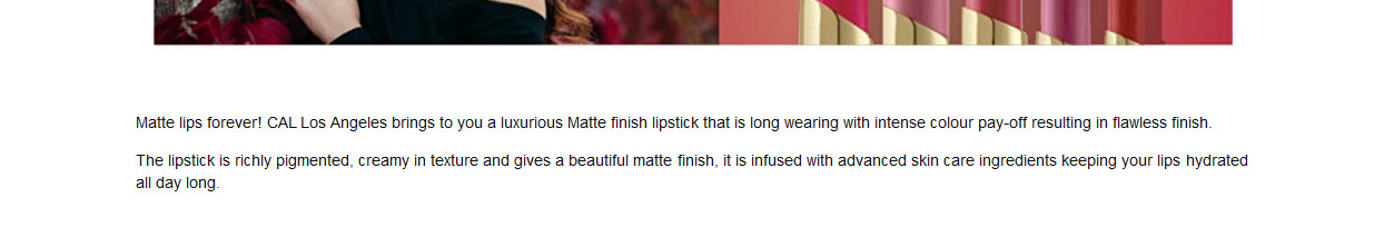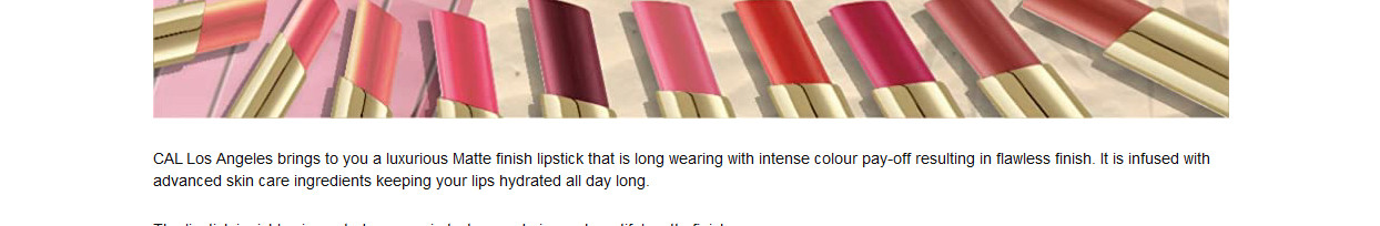 Matte lips forever! CAL Los Angeles brings to you a luxurious Matte finish lipstick that is long-wearing with intense colour pay-off resulting in a flawless finish. The lipstick is richly pigmented, creamy in texture and gives a beautiful matte finish, it is infused with advanced skincare ingredients keeping your lips hydrated all day long.