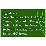 Fresh Tomatoes, Salt, Red Chilli, Cumin, Mustard, Fenugreek, Garlic, Ginger, Refined Oil, Sodium, Benzoate,Turmeric, Tamarind & Spices
