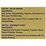EDP - Ethyl Alcohol, Diethyl Phthalate, Fragrance, Benzophenone-3, BHT, Aqua, Permitted Colour / Deo - Propellant, Ethyl Alcohol, Fragrance, Propylene Glycol, Diethyl Phthalate, Triclosan.