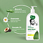 Mother Sparsh Plant Powered Natural Baby Wash is designed to cleanse the baby's sensitive skin, making it look soft and smoother afterwards. Formulated with the goodness of chamomile oil, avocado oil and coconut-based cleanser, which are some good moisturisers, exfoliate the baby’s skin and help in preventing post-shower dryness. It has no harmful chemicals such as silicon, parabens, dyes, etc., along with a tear-free formulation. The natural fragrance that makes it safe to use on your precious baby.