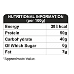 Nutrition per gram/ml: 100g Energy: 393 kcal Protein: 50g Carbohydrate: 40g Of Which Sugar: 0g Fat: 7g