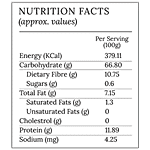Nutrition_per: 100g Serving_Size: 100g Energy (KCal): 379.11 Carbohydrate (g): 66.80 Dietary Fibre (g): 10.75 Total Sugars (g): 0.6 Fat (g): 7.15 Saturated Fatty Acids (g): 1.3 Trans Fat (g): 0 Cholesterol (mg): 0 Protein (g): 11.89 Sodium (mg): 4.25