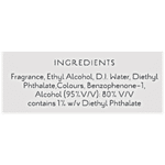 Fragrance, Ethyl Alcohol, D.I. Water, Diethyl Phthalate, Benzophenone-1, Alcohol (95 % V/V): 80 % V/V contains 1 % w/v Diethyl Phthalate, Hydroxyisohexyl 3-Cyclo Hexene Carboxaldehyde, Amyl Cinnamal, Hexyl Cinnamal, Alpha-Iso-Methylionone, Alcohol, Benzyl Benzoate, Benzyl Cinnamate, Benzyl Salicylate, Cinnamaldehyde, Cinnamyl Alcohol, Citral, Citronellol, Limonene, Eugenol, Geraniol, Hydroxycitronellal, Linalool, Butylphenyl Methylpropional