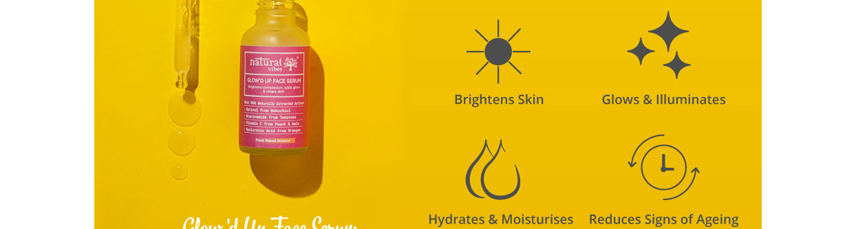 Natural Vibes Glow 'd Up Face Serum with natural plant based Niacinamide, Vitamin C, Retinol and Hyaluronic acid is a pH balanced serum that will give you a glowing, clearer, plumper and brighter looking skin with reduced signs of ageing. Powered by natural plant-based derivatives extracted from the vedic wisdom of Ayurveda, this serum will help strengthen your skin's protective barrier that diminishes over time due to environmental irritants and restores its radiance and lustre. Spotless and shining, all at once!