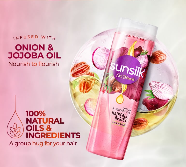 Hairfall and breakage hampering your hair growth? Are you always in search of a hairfall control shampoo that suits your hair? Try Sunsilk Onion & Jojoba Oil Hairfall Resist Shampoo - your key to dream-worthy stronger and longer hair. This o il shampoo infused with the goodness of 100% natural onion and jojoba oil, delivers nourishment for hair that is 10 times stronger so hair breaks less and grows longer. Onion is known for hair growth and jojoba is known to prevent hair breakage, together to give your hair the pampering it deserves! Say goodbye to hairfall due to breakage. Our pioneering shampoo, with no added parabens, ensures a natural and gentle cleansing experience. Rejuvenate your hair with the alluring scents of vanilla and patchouli while you unleash the goodness of nature with a shampoo that gives you stronger hair that grows longer. Experience the delight of lush, nourished hair with Sunsilk Onion Oil & Jojoba Oil Hairfall Resist Oil Blends Shampoo. Elevate your haircare routine with the amazing shampoo blended with natural goodness, nourishing your hair and making your hair stronger. Choose Sunsilk for a unique experience, where each wash brings you closer to the hair of your dreams!